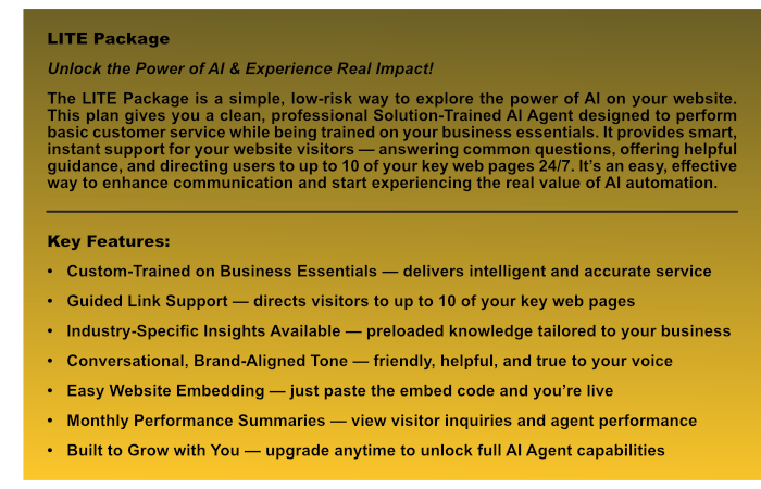 Want this AI-Powered Business-Agent on your website?Subscribe to the package that's right for your business,